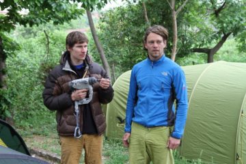 Am nächsten Morgen geht es zeitig los. Vor Aufregung hält es niemand lange im Zelt aus. Wir wollen die Routen – wie in Meteora üblich – von unten nach oben erschließen. Doch genau das ist die große Herausforderung beim Erstbegehen schwerer Routen hier. Man findet nahezu keine natürlichen Sicherungspunkte vor und die meteoratypischen Kiesel sind zu rund, sodass man nur selten Skyhooks und Schlingen anbringen kann, um daraus die Haken zu schlagen. Oft krallt man sich mit einer Hand an einem Kiesel fest, während man mit der anderen Hand das Loch für den Haken bohrt. Erschwerend kommt hinzu, dass man oft mit Bohrmaschine am Gurt klettert und am jungfräulichen Fels nicht alle Kiesel einer Belastungsprobe standhalten. Trotzdem kommen Frank und Manuel in der linken Route gut voran. Am Ende des ersten Tages haben sie anderthalb neue Seillängen eingerichtet. In der rechten Route geht es deutlich schleppender voran. Die Gesteinsqualität ist im unteren Bereich etwas gewöhnungsbedürftig und es ist gleich zu Beginn ziemlich schwer. Ich bin nach vier gebohrten Haken vorerst moralisch verschlissen. Fele und Manuel zeigen vollen Einsatz und so steht Manuel am Ende des Tages auf dem kühlschrankgroßen Kiesel, der das Ende der ersten Seillänge markiert.